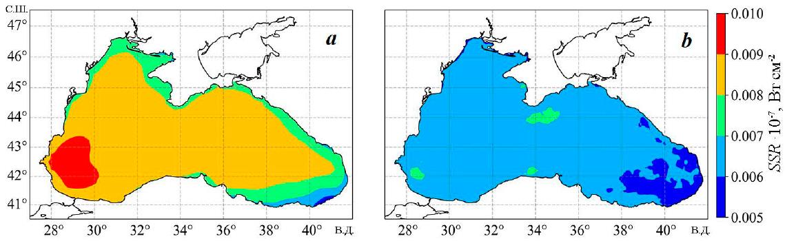 For the summer period, the heat fluxes from the atmosphere were analysed and the reconstructed temperature was compared with the data obtained in 87th cruise of R/V Professor Vodyanitsky (30 June – 18 July 2016). It was found that the difference in the heating intensity of the upper water layer in two calculations (Fig. 5, a, b) was related to differences in the magnitude of the solar radiation flux. Thus, the monthly solar radiation flux at the sea surface for June 2016 was 249.51 and 187.43 W/m2 according to ERA5 and SKIRON data, respectively. The spatial distribution of the flux (Fig. 6) is also consistent with the non-uniformity of the temperature distribution in the western and eastern parts of the sea: for both forcings, the solar radiation flux in the western part is higher than in the eastern one.