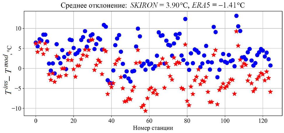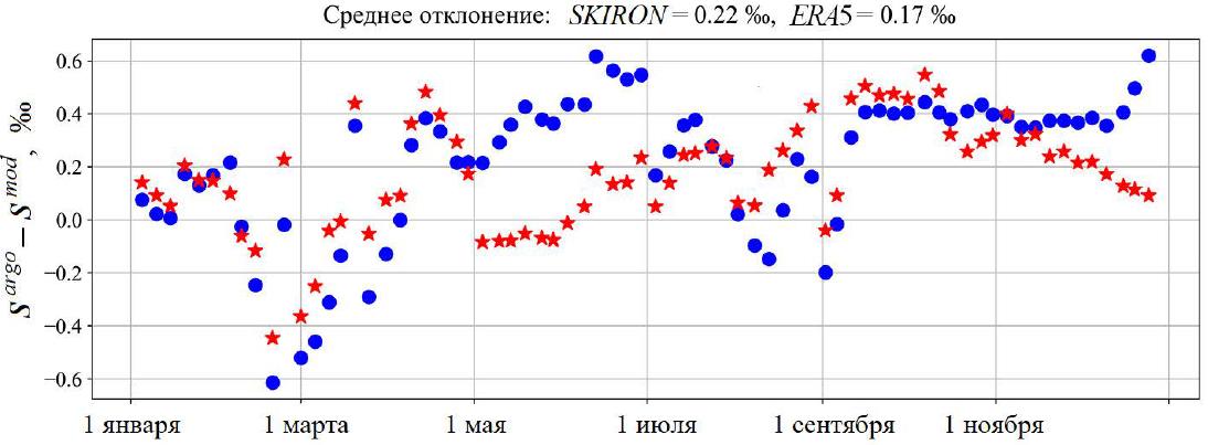Fig. 7. Temperature deviation between the measurement data of 87th cruise of R/V Professor Vodyanitsky and the results of numerical experiments ERA5 (stars) and SKIRON (circles) at the 15 m horizon