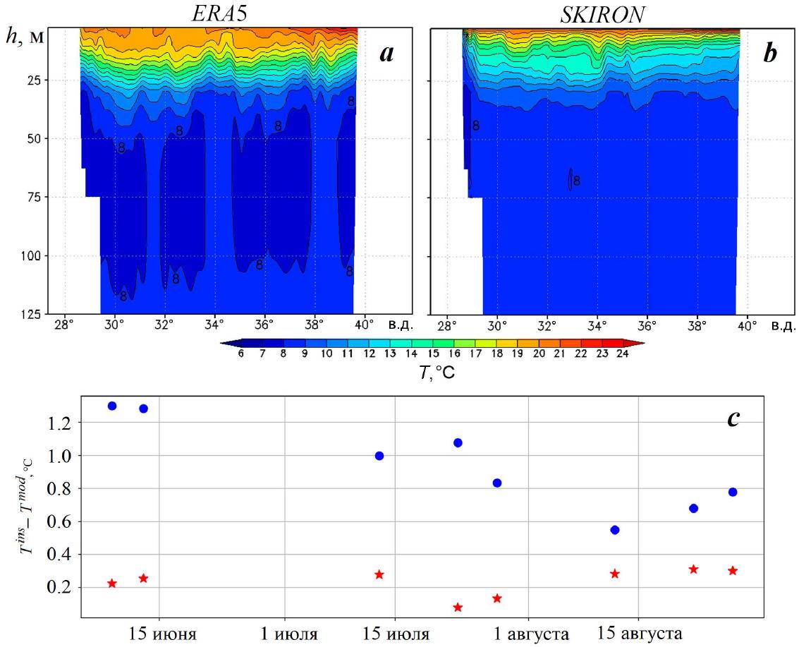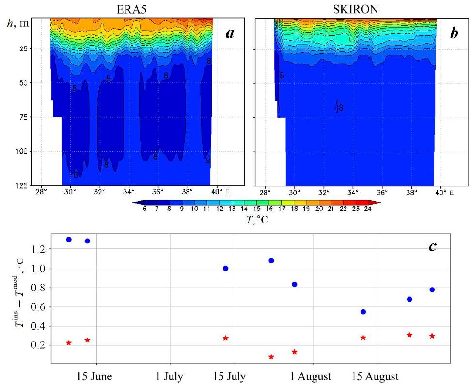Fig. 8. Zonal sections of temperature fields along 43.5° N for 15 June 2016 obtained by using atmospheric forcing ERA5 (a) and SKIRON (b). Temperature deviation between the measurement data of ARGO profiler float no. 6901831 and the modeling results of numerical experiments ERA5 (stars) and SKIRON (circles) (c) at the 75 m horizon