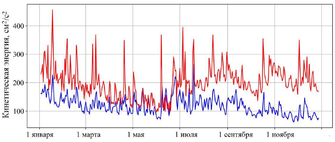 Fig. 11. Time variability of mean current kinetic energy in the upper model horizon according to data of ERA5 (red line) and SKIRON (blue line) experiments