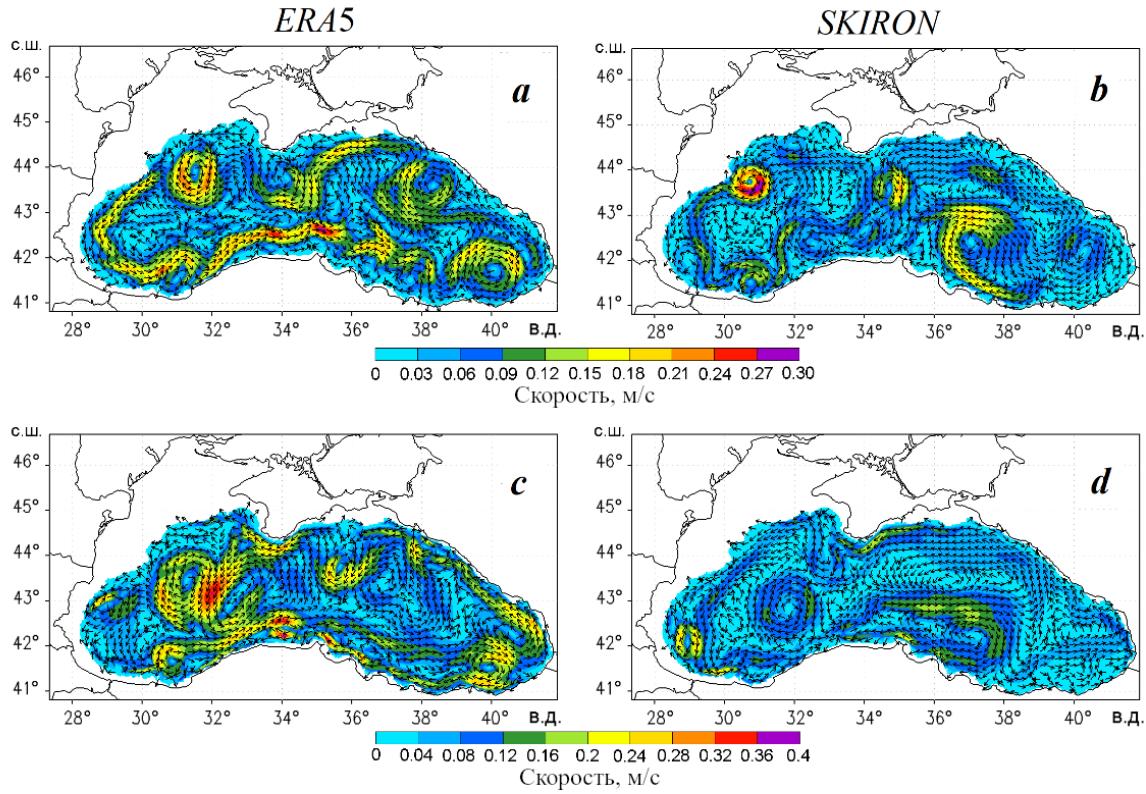 Fig. 12. Current velocity fields obtained by using atmospheric forcing ERA5 (a, c) and SKIRON (b, d) at the 100 m horizon on 15 June 2016 (a, b) and 15 December 2016 (c, d)