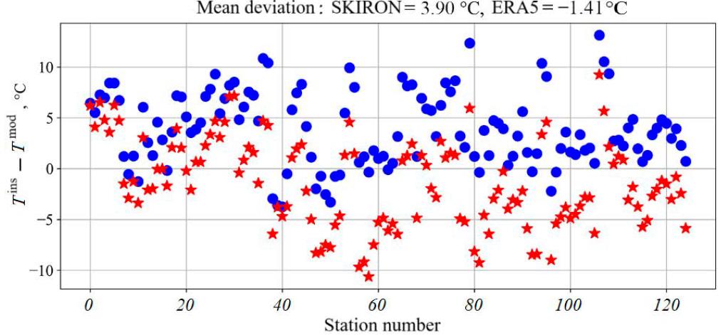 8. Fig. 7. Temperature deviation between the measurement data of 87th cruise of R/V Professor Vodyanitsky and the results of numerical experiments ERA5 (stars) and SKIRON (circles) at the 15 m horizon