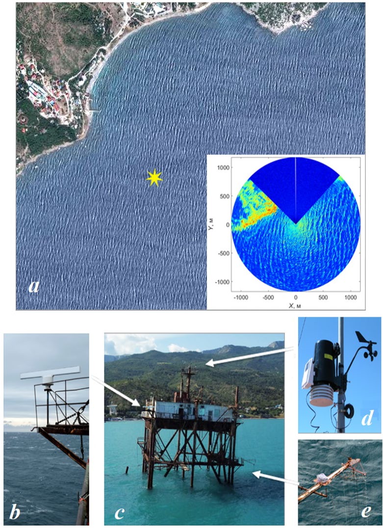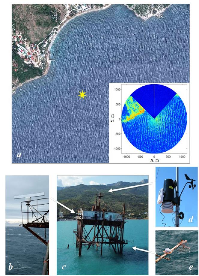 Fig. 1. Study area (a) and equipment used. The star indicates the location of the stationary oceanographic platform; the inset shows a radar image of the sea surface; b – MRS-1011 radar station; c – stationary oceanographic platform, the arrows indicate the location of the equipment shown in b, d, e; d – meteorological station; e – string wave recorder