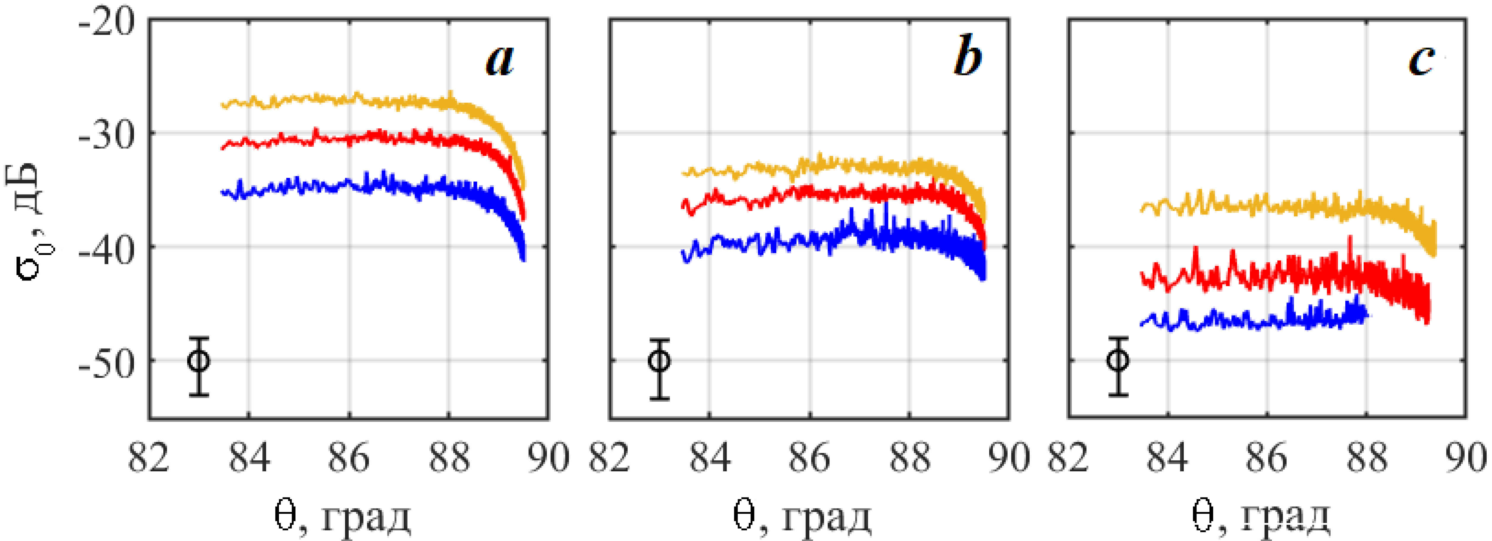 Fig. 4. Normalized radar cross-section (NRCS) of the sea surface s a function of the angle of observation for ‘up-wind’ (a), ‘perpendicular to the wind’ (b) and ‘down-wind’ (c) measurements. The blue line is data averaged over the range U = 7.0 ± 1.5 m/s; the red line is 11.0 ± 1.5 m/s; the orange line is 15.0 ± 1.5 m/s. Confidence intervals are given in the bottom left part of the figure