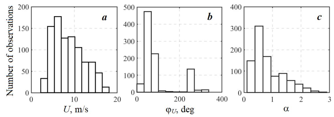 Fig. 2. Histograms of wind and wave measurement conditions: a – wind speed; b – wind direction; c – wave age