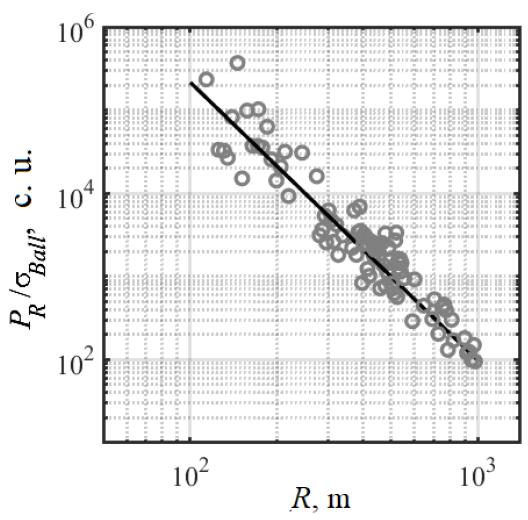 Fig. 3. Dependence of the received signal power normalized to the ball radar cross-section on the distance to the target. The straight line shows approximation by power function (1)