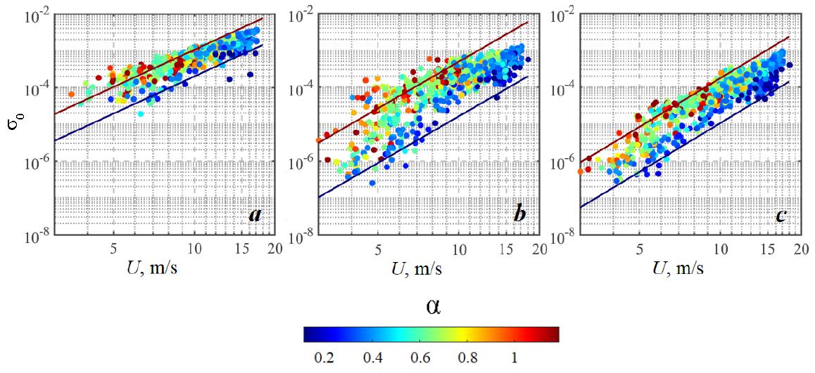 As follows from Fig. 5, power dependency of s0 on wind speed is observed. Note that for the same wind speed at the measurement level, the values of s0 increase with increasing a, i. e., in the process of wave development. This regularity is characteristic of all selected observation azimuths. With a changing from 0.1 to 1.2, the weakest growth of s0 by ~5 times is observed for s0up, and the largest NRCS increase by about 30 times is characteristic for s0cr. The obtained dependency of s0 on wind speed and wave age confirms the appropriateness of describing the sea surface NRCS in form (5).