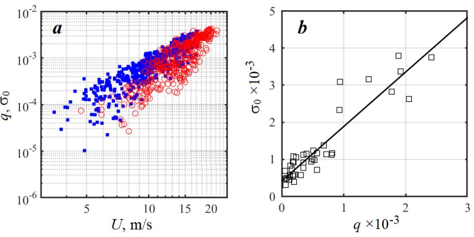 In Fig. 6, a, squares represent the values of s0up at wind speeds from 2.2 to 17.1 m/s, circles represent the values of q obtained at U = 4.7–21.4 m/s. Both wind dependencies almost coincide, but a slight difference is observed at U < 10 m/s; in these cases, a stronger decrease in the value of q is observed with decreasing wind. This can be explained by the fact that during moderate and weak winds, small breaking crests that contribute significantly to the value of q are not identified during video processing [27, 28]. At the same time, such breaking is involved in the formation of the NRCS.