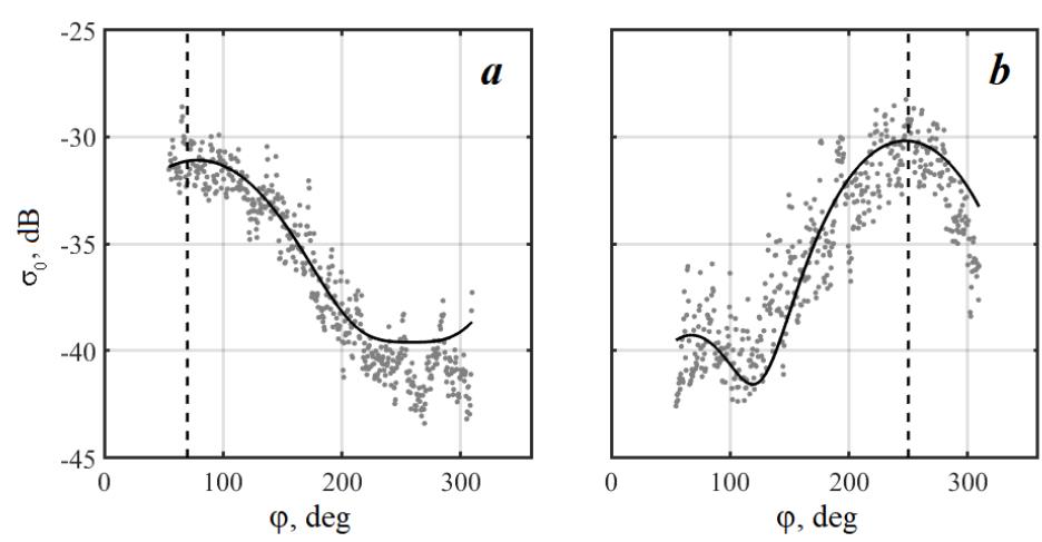 Fig. 7. The sea surface NRCS as an azimuth angle function at U = 9 m/s, jU = 70°, a = 0.8 (a); U = 15 m/s, jU = 250°, a = 0.2 (b). The dashed lines are for wind direction retrieved from the anemo-meter data