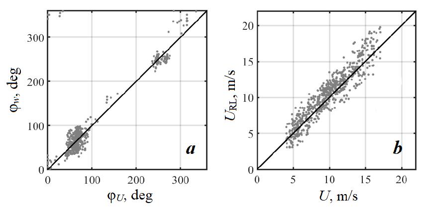 Speeds URL and jw were calculated for the whole data array by the least squares method according to formula (6) using in situ radar measurements. Fig. 8 shows the comparison of wind speed direction and vector magnitude retrieved from radar data with those retrieved from the anemometer.