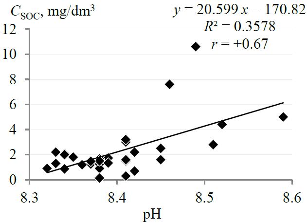 Correlation dependence of DOC and SOC concentration on water pH was revealed in summer. The SOC dependence of pH (r = 0.67 and 0.62 for the surface (Fig. 6) and bottom layer, respectively) was stronger than the DOC dependence of pH (r = 0.48 and 0.57 for the surface and bottom layer, respectively). For all theabove mentioned dependencies, n=74; α=0.05.