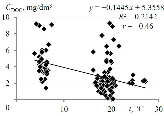 Despite the increase in the hydrogen ion concentration (pH) indicating the activation of OM primary production (Table 1), a decrease in the DOC content was observed from spring to autumn, both in the surface and bottom layers, which is explained by the increased insolation inhibiting photosynthesis in the summer and autumn period 11).