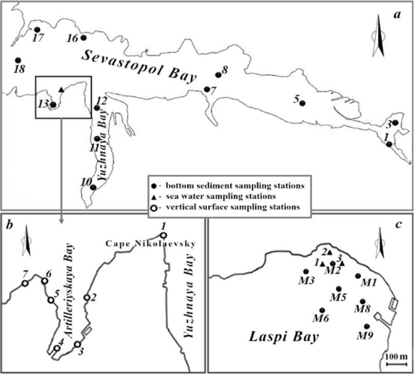 Location of sampling stations for bottom sediment in Sevastopol Bay (a), mytilasters from hydraulic structures in Sevastopol Bay (b) (literature data [12]) in 2012, 2015, 2018 and seawater and bottom sediment in Laspi Bay in 2017 (c) (literature data [22])