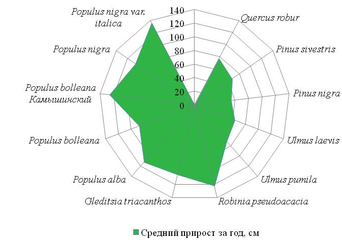 Из таблицы видно, что по росту виды располагаются в нисходящий ряд: робиния мачтовой формы, робиния морозоустойчивой формы, тополь Болле, гледичия бесколючковой формы, вяз гладкий, вяз приземистый, дуб крупноплодный.
