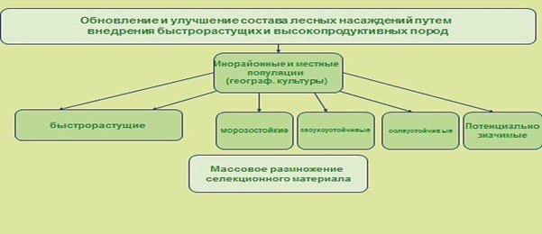 Дополнительными хозяйственно-ценными для древесных пород признаками при отборе для селекционных и лесомелиоративных целей являются также форма ствола, ажурность и др. Общая схема улучшения состава лесных насаждений в местных и инорайонных популяциях показана на рисунке 5.