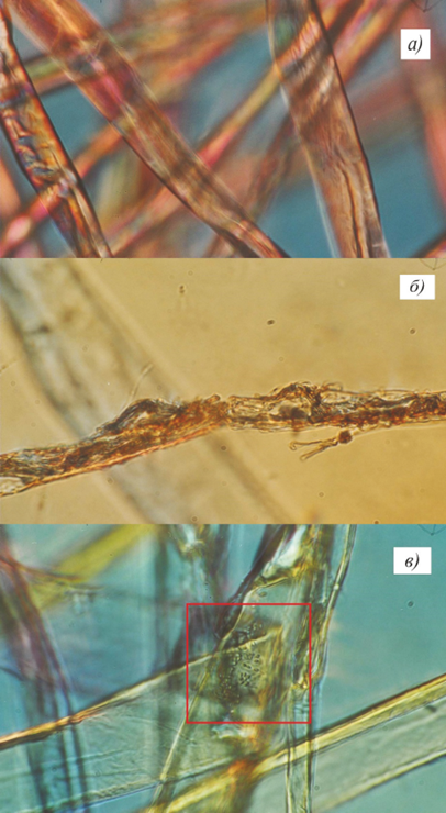 Рисунок 1. Микрофотографии хлопковых волокон (100х10х2,5): не поврежденные микроорганизмами (а), повреждения класса С после 240 суток экспозиции – глубокая деструкция, разрушение оболочки с резко обозначенными краями (б), колония микроорганизмов внутри канала волокна (в)