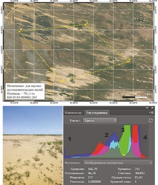 Рисунок 2. Карта тестового участка «Ногайский 1» (полигон Ногайский район, Дагестан); фотоэталон; гистограмма распределения пикселей на фотоэталоне в режиме «Цвета»: 1 – диапазон фототона растительности; 2 – диапазон фототона неба; 3 – диапазон фототона песчаного массива; 4 – диапазон фототона тени