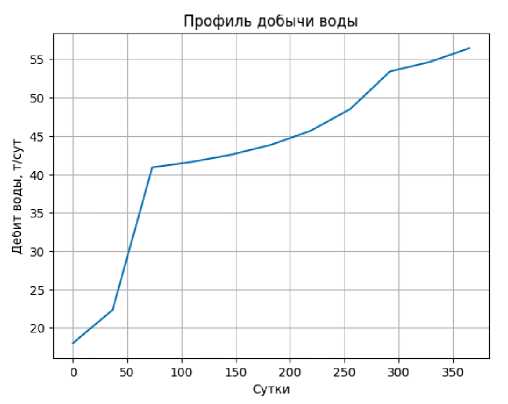 Профиль добываемой жидкости после проведения операции ГРП рассчитывался при помощи методики Баклея–Леверетта. Подробно данная методика описана в [16, 18], поэтому в данной статье оно не приводится. Допущения, которые делаются при использовании данной модели, описаны выше.