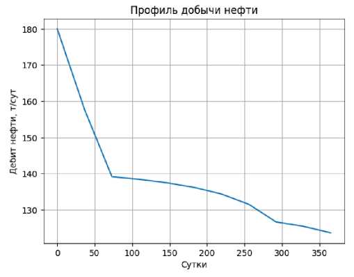 Также в данной работе суммированием добычи нефти элемента за промежутки времени, на которые был разделен год, было рассчитано, сколько тонн нефти будет добыто из скважины после проведения ГРП. Эта величина составила 1358 т за исследуемый промежуток времени. Расчет не приводится.
