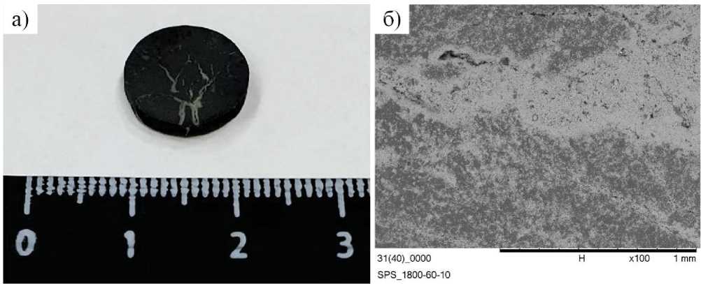 На рис. 3 приведены фотография полученного объемного материала и РЭМ снимок его поверхности. Поверхность характеризуется естественной шероховатостью, наличием пор и трещин. Это может быть следствием значительного количества несвязанного углерода в составе исходной смеси, который охрупчивает конечное изделие. Тем не менее получение такого рода объемного образца из исходной шихты само по себе является интересным научным результатом в связи с известными особенностями и трудностями при спекании карбидокремниевой керамики [39].