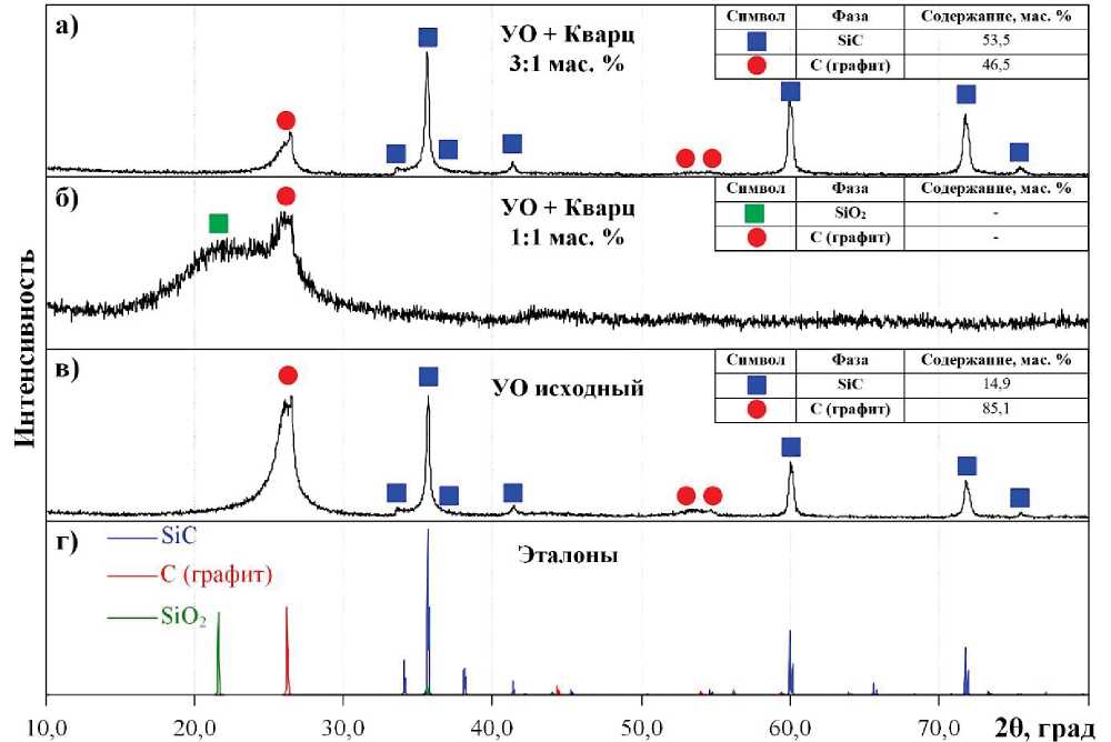 Как видно, введение дополнительного компонента (кварцевого песка) существенно влияет на конечный фазовый состав, что выражается в принципиально разном характере картин рентгеновской дифракции. При незначительной добавке кварца (рис. 4, а) наблюдается снижение относительной интенсивности графитовых максимумов (~ 26 град.) в сравнении с образцом из исходного УО (рис. 4, в) и возрастание максимумов, соответствующих фазе SiC. В конечном итоге это выражается в троекратном повышении количественного выхода SiC до 53,5 мас. % в составе объемного изделия.