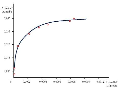 где A – количество сорбируемого вещества, моль/г; А∞ – предельное количество сорбированного вещества (емкость адсорбционного монослоя), моль/г; C – равновесная концентрация адсорбтива, моль/л; K – константа сорбционного равновесия, характеризующая интенсивность процесса сорбции, л/моль.