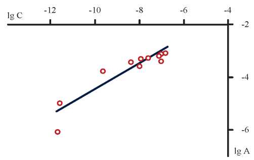 Представление экспериментальных данных (табл. 2) по уравнению (7) в координатах lgA=f(lgC) позволяет графически определить значения K и n (рис. 3) [20]. Последующая обработка экспериментальных данных методом наименьших квадратов показала, что изотерма сорбции описывается уравнением прямой (8) с коэффициентом корреляции (R2=0,8520):