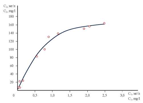 Из рис. 4 следует, что полученная изотерма представляет кривую линию, характерную для процесса адсорбционного осаждения. Последующая обработка экспериментальных данных по уравнению (10) и методике, представленной в [22], показала, что графически эта зависимость в логарифмических координатах lgС2=f(lgС1) (рис. 5) описывается уравнением прямой линии (13) с углом наклона 26° при величине достоверности аппроксимации R2=0,8803: