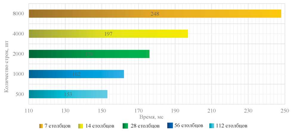 Несмотря на увеличение времени обучения модели с увеличением объема набора данных, скорость обучения поражает своими низкими значениями. Например, как видно из рис. 2, при общем размере набора данных 8000 строк на 7 столбцов средняя скорость обучения одной модели составляет всего 248 мс. Соответственно, использование такого подхода для разработки методологии выбора рабочего оборудования может сэкономить огромное количество времени, особенно при проверке гипотез о возможных зависимостях между заданными параметрами, предоставляя возможность для более подробного изучения рассматриваемых зависимостей.
