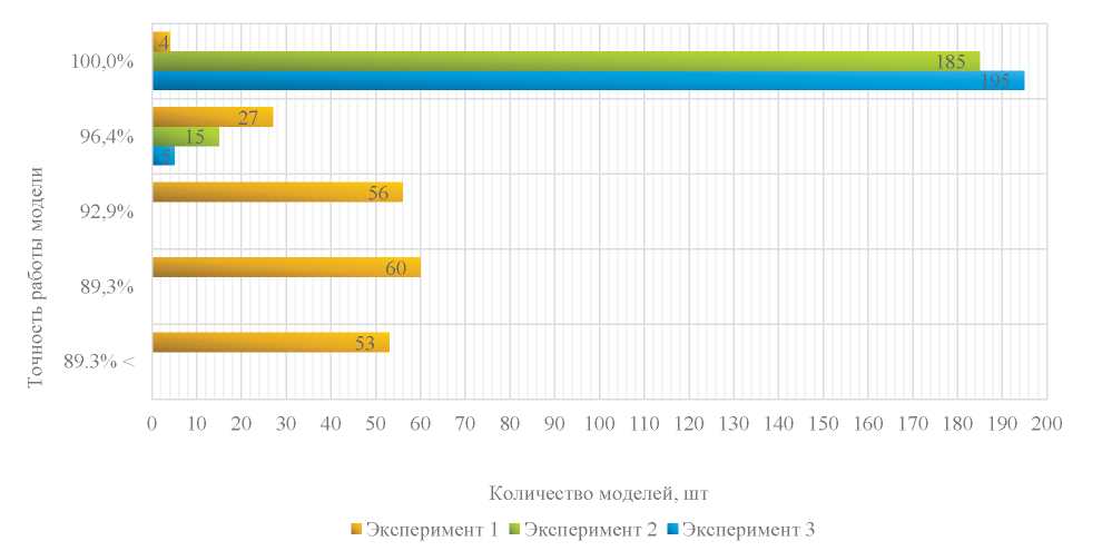 Более того, необходимо аккуратно подходить к вопросу выбора подходящей метрики для проверки точности модели, поскольку разные метрики имеют разные целевые характеристики для сравнения, что может определенным образом исказить конечные результаты. Графическое представление точности обученных моделей и их количества для каждого из экспериментов можно увидеть на рис. 5, где точность оценивалась с использованием метрики Accuracy_score, и на рис. 6, где точность оценивалась с использованием специальной метрики.