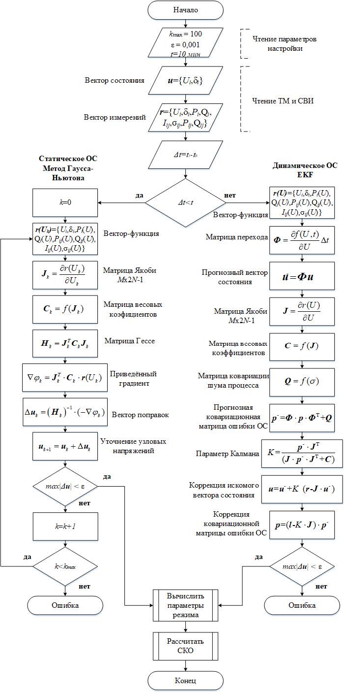 Предлагаемый метод ОС представляет собой синтез усовершенствованных статического и динамического методов на основе математического аппарата Гаусса–Ньютона и EKF. При резком изменении схемно-режимной ситуации ОС выполняется статическим методом на заданном интервале времени Δt для формирования матрицы перехода, которая далее используется в качестве исходных данных для выполнения ОС динамическим методом.