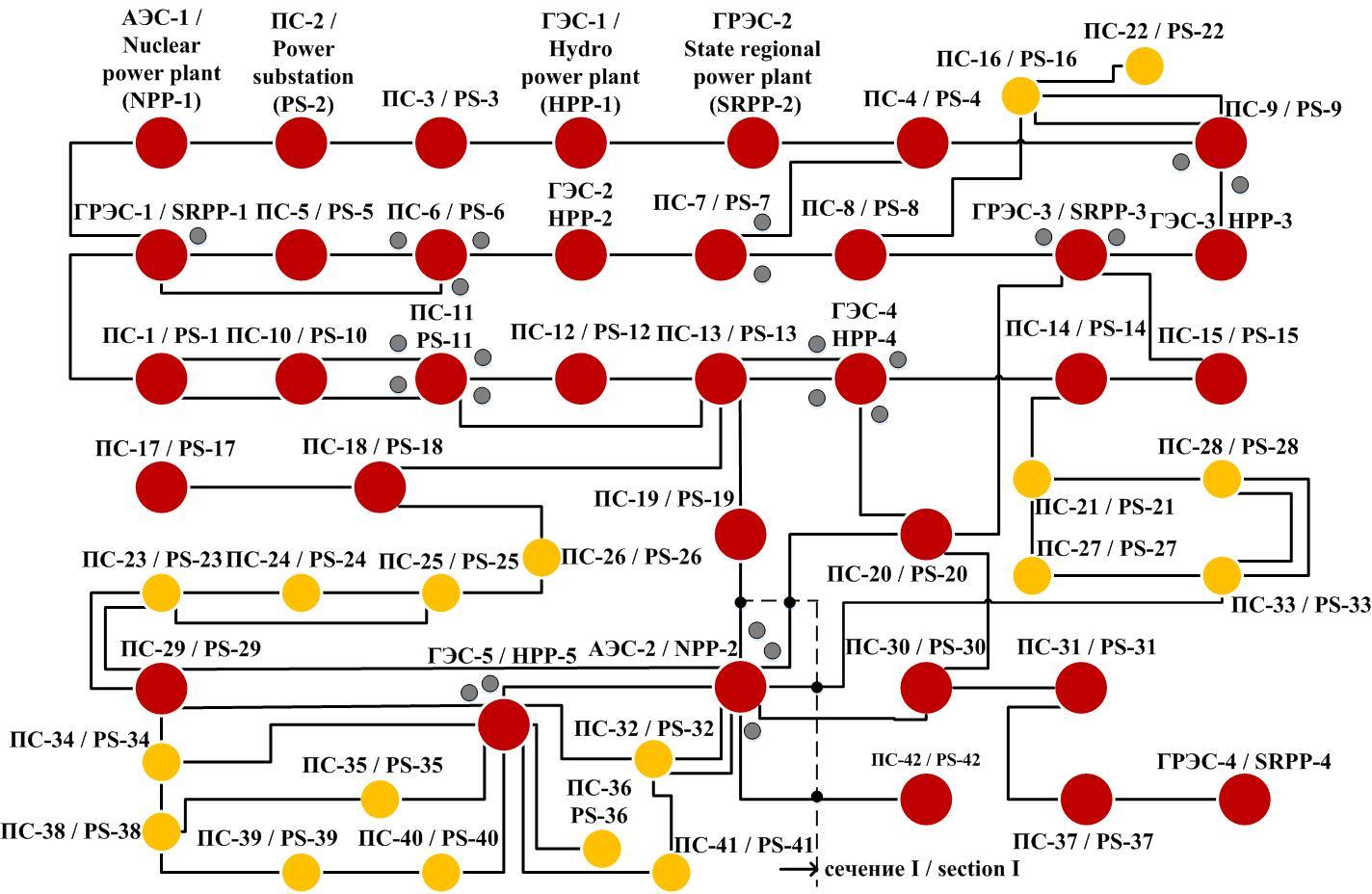 Рис. 2. Топологическая схема электрической сети 500–220 кВ ОЭС: схема содержит 55 узлов и 76 связей. Устройства СМПР отмечены серым кругом. Красными кругами отмечены энергообъекты 500 кВ, желтыми – 220 кВ. В ПАК СМЗУ контролируется сечение I, в состав которого входят воздушные линии (ВЛ) 500 кВ: АЭС-2–ПС-42, АЭС-2–ПС-19, АЭС-2–ПС-20, АЭС-2–ПС-30; 220 кВ: АЭС-2–ПС-33, АЭС-2–ПС-36. Локальное устройство ПТК ЦСПА установлено на АЭС-2 и предназначено для предотвращения нарушения устойчивости энергоблоков АЭС.