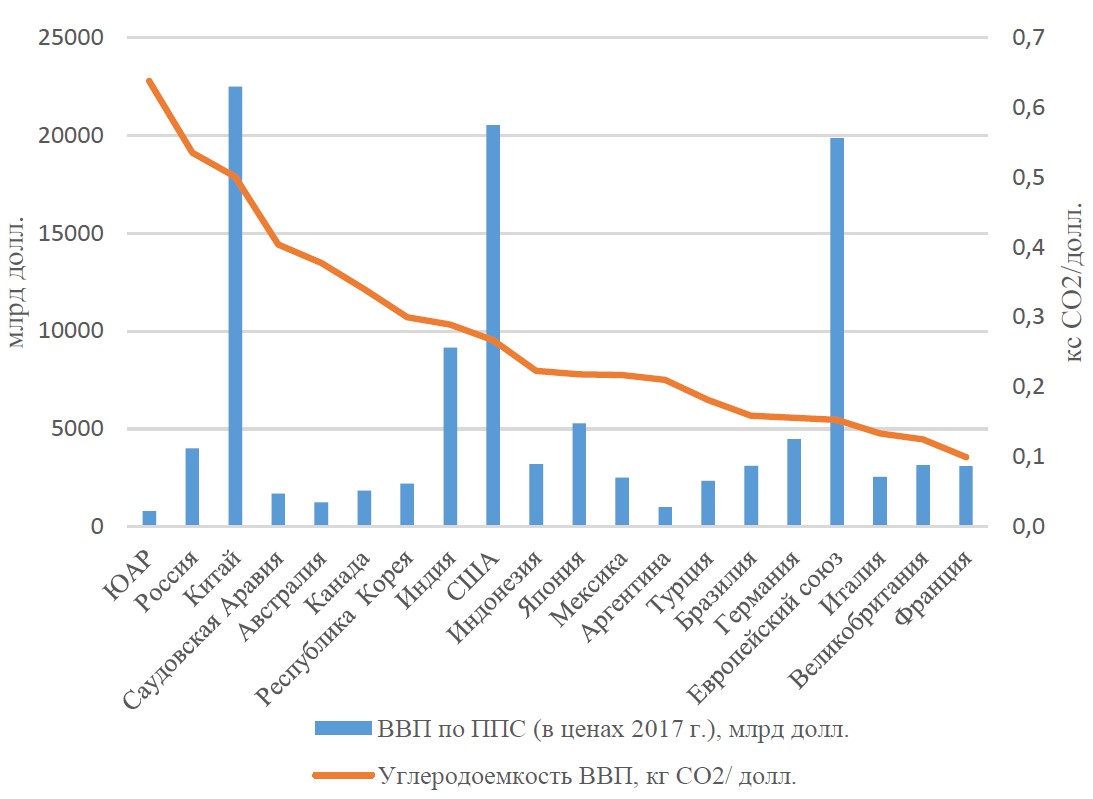 Рисунок. Зависимость углеродоемкости ВВП и ВВП по ППС (паритет покупательной способности) (в ценах 2017 г.)
