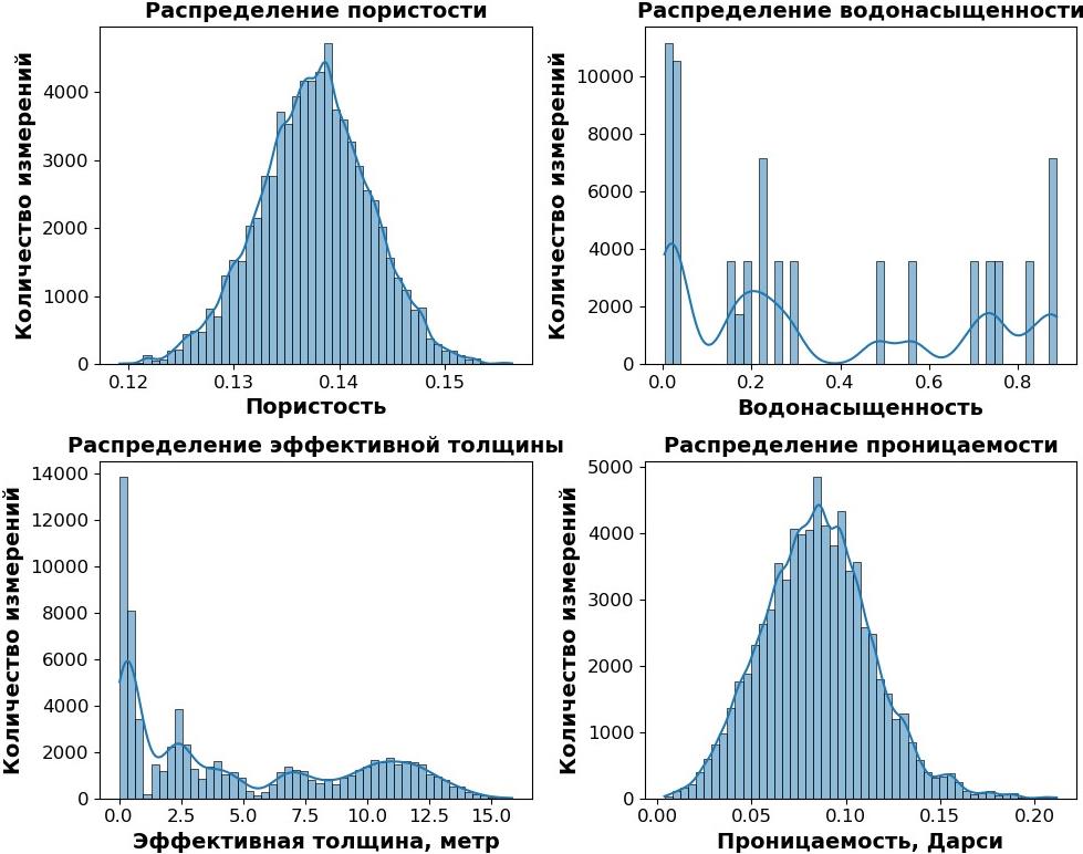 Значение корреляции параметра эффективной толщины с целевой переменной может быть отрицательным, хотя он положительно влияет на целевую переменную. Данное явление связано с тем, что другие параметры (временной шаг, петрофизика и давление) вносили более значимый вклад в результирующий дебит газа. В дополнение было получено распределение для данных геологии c целью оценки характера плотности распределения входных параметров (рис. 2).