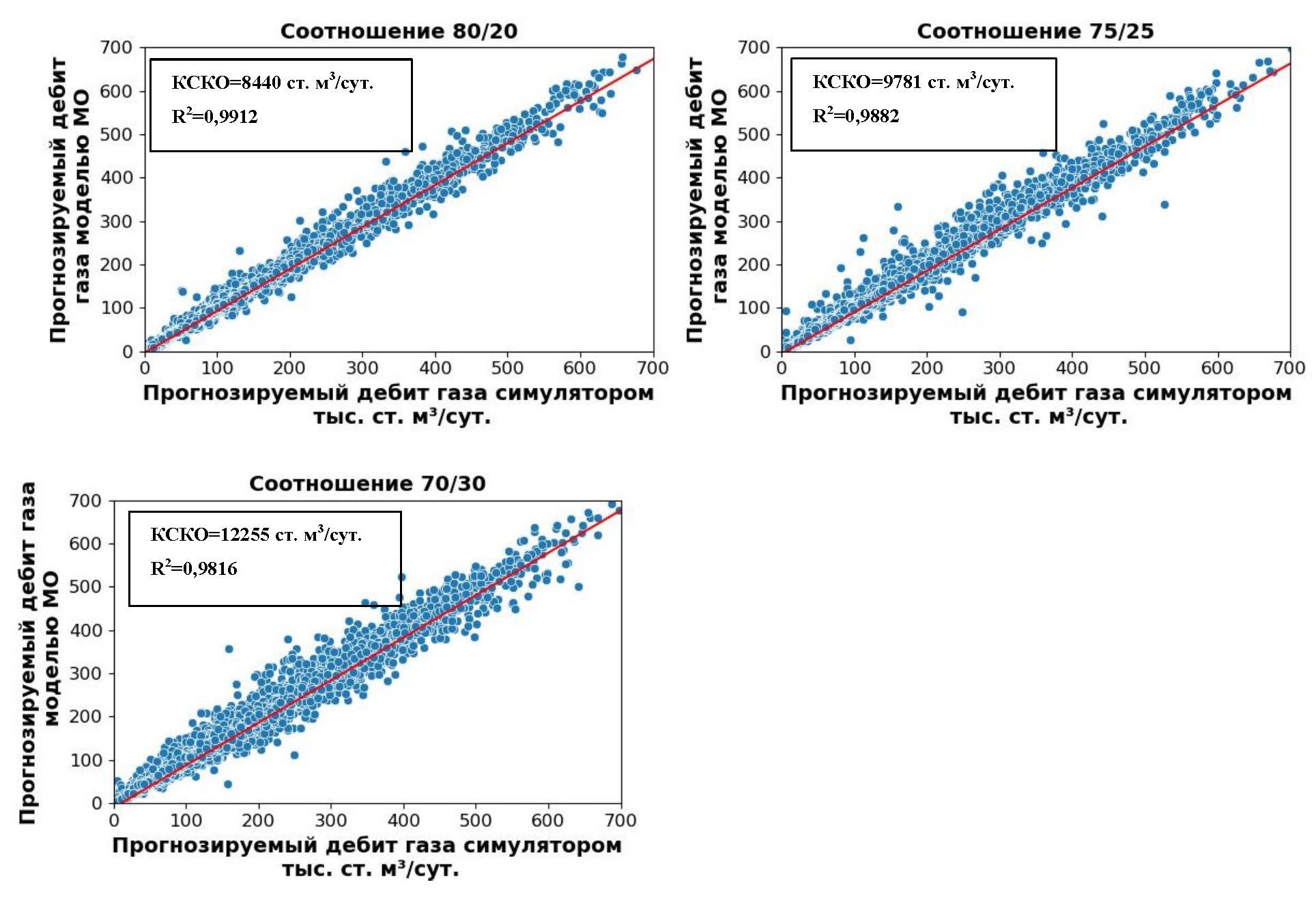 Несколько моделей машинного обучения c различным соотношением тестовой выборки к тренировочной применено для получения оптимального решения задачи прогнозирования дебита газа. Данное решение имеет наименьший показатель средней квадратичной ошибки (Root Mean Square Error – RMSE), средней абсолютной процентной ошибки (Mean Absolute Percentage Error – MAPE) и наибольший показатель коэффициента детерминации (R2) для тестовой и тренировочной выборок.