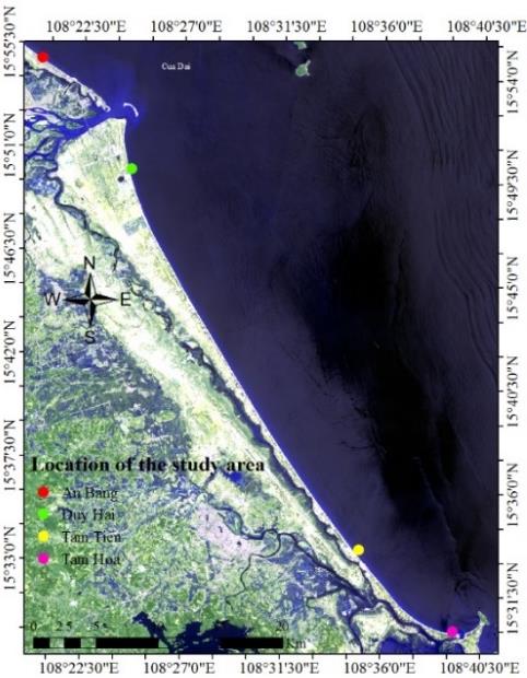 Quang Nam boasts a 125 km coastline and numerous estuaries, making it a region with significant potential for tourism development and playing an important role in socio-economic growth. In recent years, due to extreme weather conditions, the rainy season is affected by the northeast monsoon, tropical depression and often storms, these factors have a strong impact on the coastal area of Quang Nam province, causing very serious erosion affecting the lives of people in coastal areas [3]. Therefore, monitoring the shoreline change in Quang Nam is necessary for the sustainable management of the coastline in this area in the context of climate change.