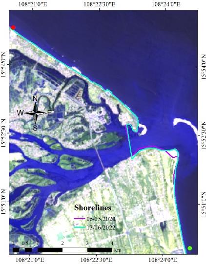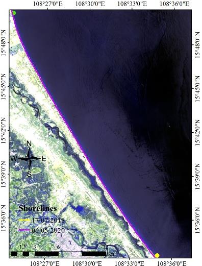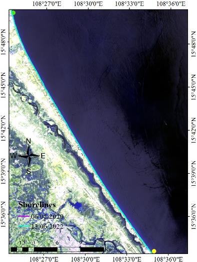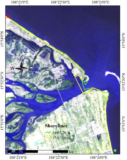 Coastal change monitoring technology is widely applied in the world, at present, there have been many studies using remote sensing data to classify land water from multi-time satellite images combined with geographic information system (GIS), and then superimposed to identify and evaluate shoreline changes. Specifically, the authors in used Landsat images combined with GIS to study shoreline changes in the Göksu estuary from 1984 to 2011 [4]. And the authors of extracted shorelines from multi-temporal (7 ETM+) satellite images combined with GIS to study the change of Marina coastline from 2009 to 2019 [5]. Abdoul et al studied and The research presents the Yanbu coastline change from 1965 to 2019 using Landsat and GIS satellite images [6].