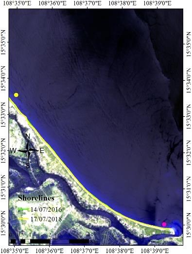Besides, there have been a lot of studies on shoreline changes done in Vietnam in recent years. Specifically, Nhan et al. calculated the changing speed and trend of the Red River bank from Son Tay to Gia Lam area (Hanoi) using remote sensing images for the period 2007–2016 combined with GIS [7]. Tuan et al. used water indices such as NDWI, MNDWI, AWEI from Landsat 8 remote sensing images to determine water and land boundaries on the West coast of Vietnam [8]. Mau et al. used remote sensing images combined with shoreline survey by DGPS–Promark2, the results show that the erosion rate is higher than the deposition rate in Cua Dai area, mainly due to construction works and impacts of wave [9]. Cham et al. used remote sensing in combination with Delft3D and Mike 11 models to determine the cause and mode of erosion and deposition in Cua Dai area, showing that the process of erosion-deposition occurs in the Northeast winter with the cause of impacts wave motion of the northeast monsoon with wave height of approximately five meters with a frequency of more than 70% [10]. Quang et al. used the Digital Coastal Analysis System (DSAS) technique to statistically calculate the rate of change of the Quang Nam coastline from 1990 to 2019, showing that the Quang Nam coast was eroded and deposited over the past three decades and erosion is most severe in the north of Cua Dai, while shoreline evolution is recorded in the southern region [11]. In the authors used Telemac model combined with hydrodynamic and wave module to study Cua Dai area, showing the main trend of currents and waves towards the south, leading to erosion especially in the northeast monsoon season and deposited in the estuary [12].