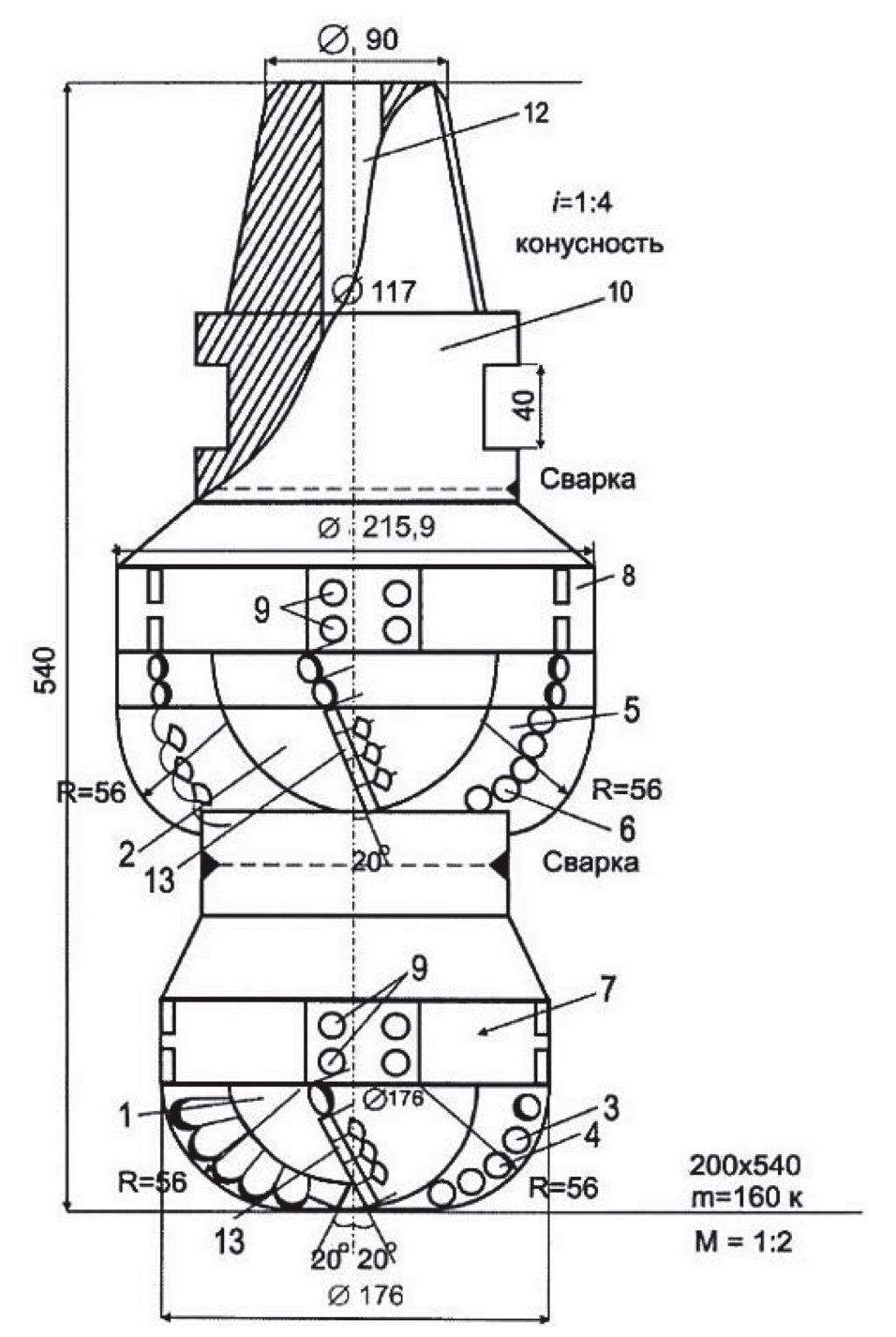 Рис. 1. Двухъярусное антивибрационное долото: 1 – забуривающий ярус; 2 – разбуривающий ярус; 3 – режущие лопасти нижнего забуривающего яруса; 4 – резцы нижнего разбуривающего яруса; 5 – режущие лопасти верхнего разбуривающего яруса; 6 – резцы верхнего разбуривающего яруса; 7, 8 – стабилизаторы; 9 – штыри; 10 – хвостовик; 11 – сменные гидромониторные насадки; 12 – промывочное отверстие; 13 – конусные PDC верхнего и нижнего ярусов
