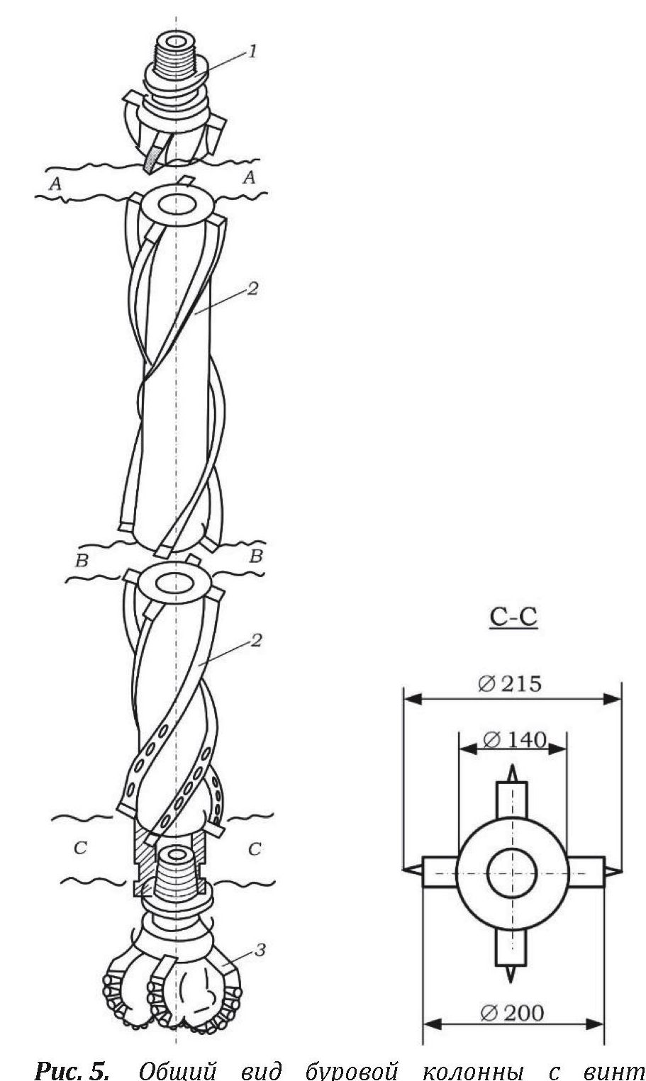 Рис. 5. Общий вид буровой колонны с винтовыми ребрами: 1 – переводник под гладкую буровую колонну; 2 – винтовая буровая колонна; 3 – долото. Для Æ 140 мм: n=200 об/мин (3,5 р/с); Va=3–3,5 м/с; t=100 мм (»1 м); шаг винта h=90 %