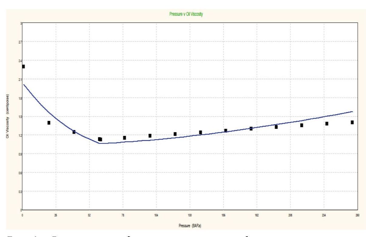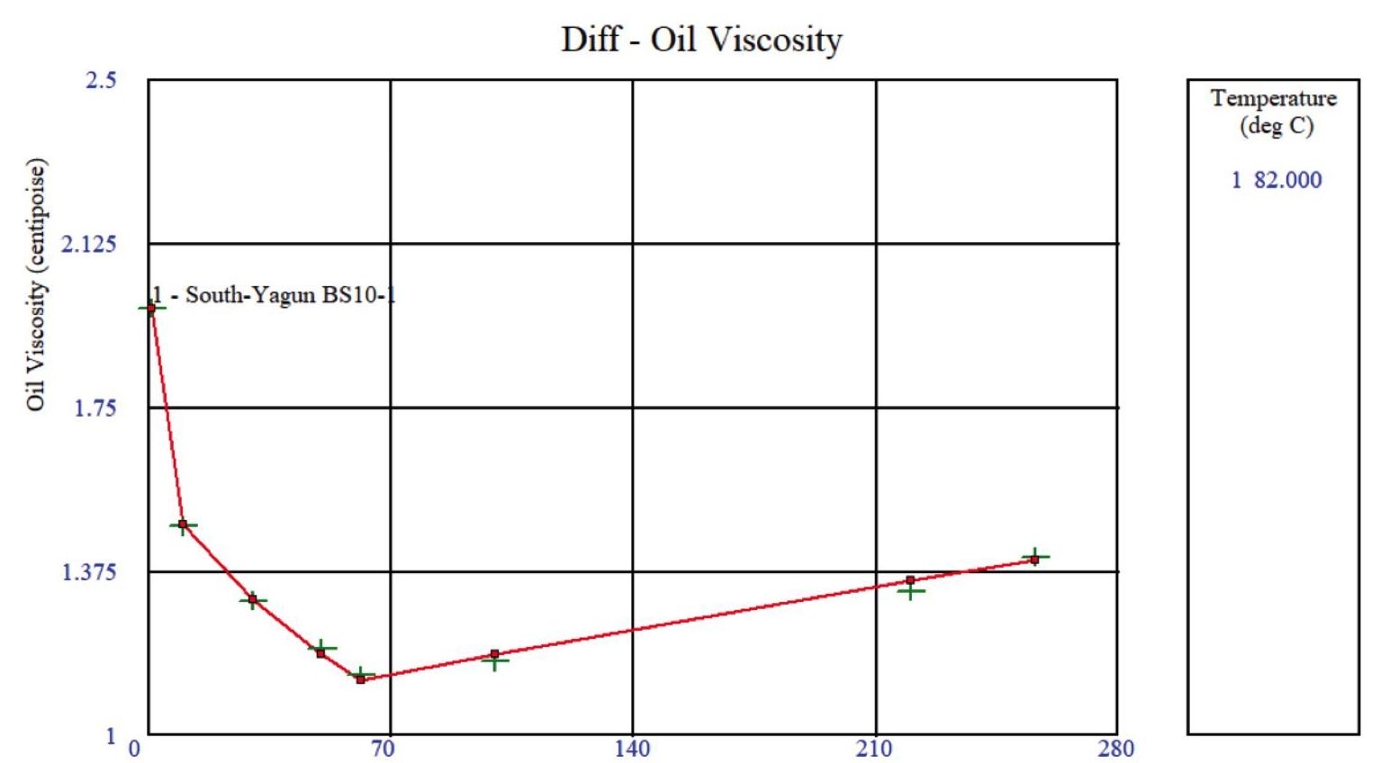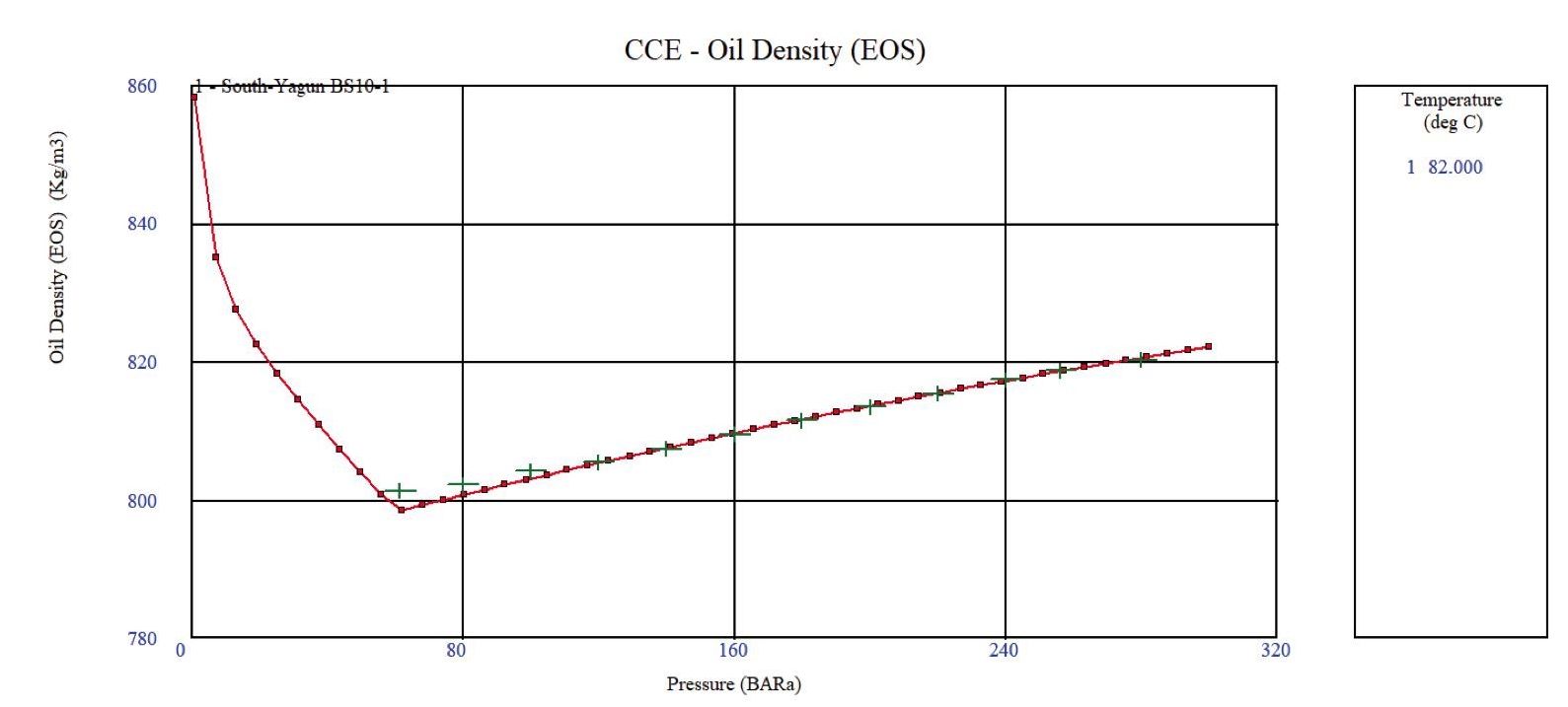 Чёрными точками отображены значения, полученные на адаптированной модели уравнения состояния. Эти данные используются для выбора наиболее подходящей корреляции модели чёрной нефти (эта корреляция на графике отображена синим цветом).