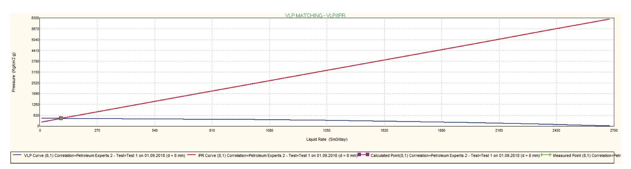 По результатам расчёта оценивается, насколько расчётное значение по дебиту жидкости (пересечение кривых VLP и IPR) совпадает с фактическим (рис. 8).