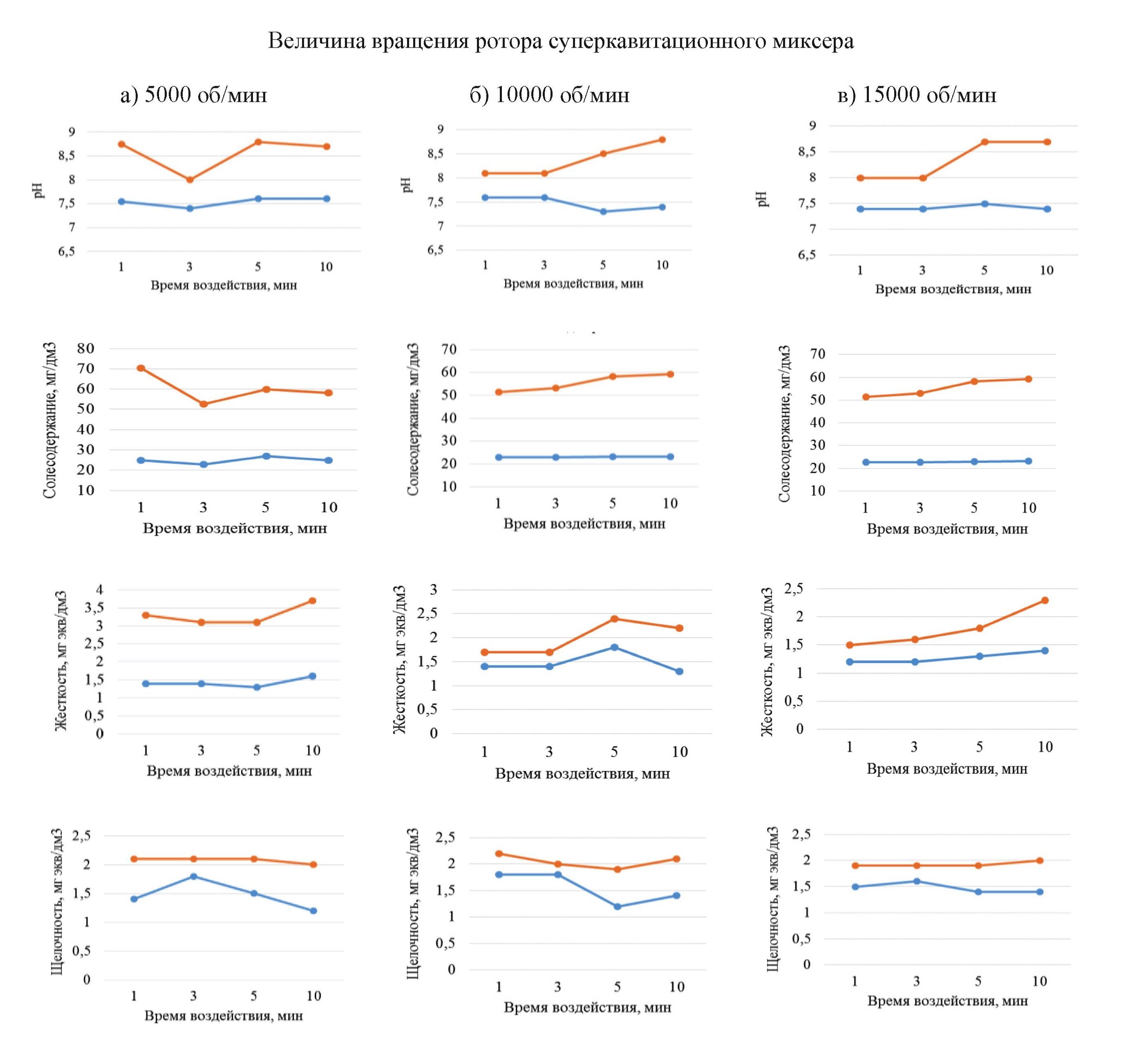 Двенадцать проб воды, каждая по 500 мл, подверглись кавитационной обработке: время обработки 1, 3, 5 и 10 мин, скорость вращения кавитатора в каждом случае составляло 5, 10 и 15 тыс. оборотов в мин. Следом за каждым воздействием проба анализировалась по величине водородного показателя рН, удельной электропроводности (УЭП), температуре. После поочередной разморозки у исследуемых образцов измерялись следующие параметры: