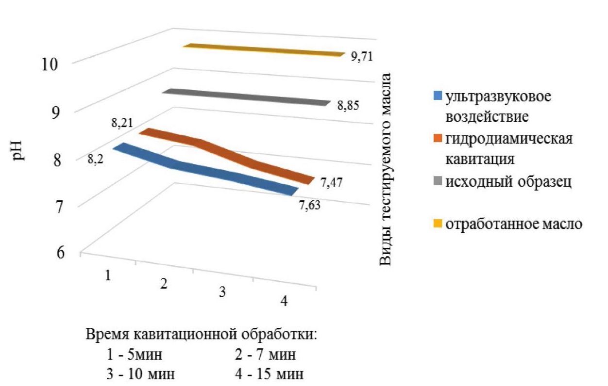 Кроме того, величина водородного показателя проб, подвергшихся кавитации, находится в диапазоне 6–8 (рис. 3), что является оптимальным даже для исходных матричных масел. В отличие от проб № 1, 2, где в первом случае масло содержит присадки, а во втором закислен в процессе эксплуатации оборудования.