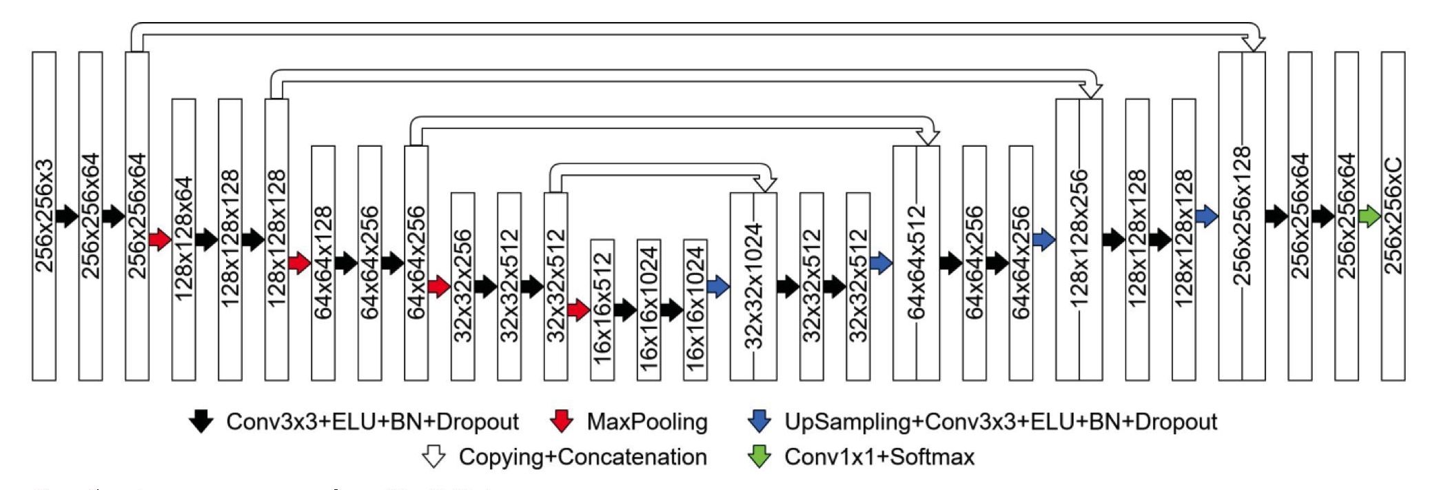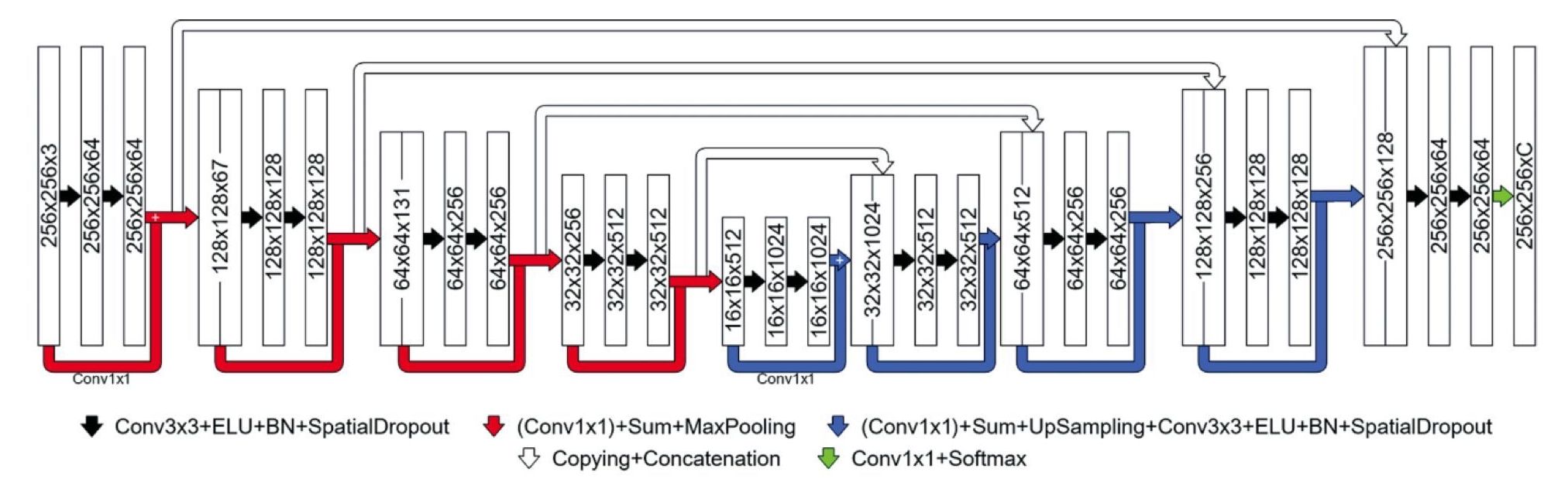 Модификация модели U-Net. Первая предложенная модель, названная Мо-U-Net, является модификацией известной классической полносверточной сети U-Net для решения задачи семантической сегментации изображений [22]. Отличительной чертой классической модели U-Net является наличие соединений пропуска (англ. skip-connections), объединяющих наборы карт признаков кодера с наборами карт признаков декодера с целью повышения детальности результирующей карты сегментации [22]. На рис. 5 приведена архитектура модели Мо-U-Net, предложенной нами на основе классической U-Net. Прямоугольники соответствуют тензорам, или многомерным массивам, представляющим наборы карт признаков, числами указаны размеры соответствующих тензоров, стрелками обозначены следующие операции: