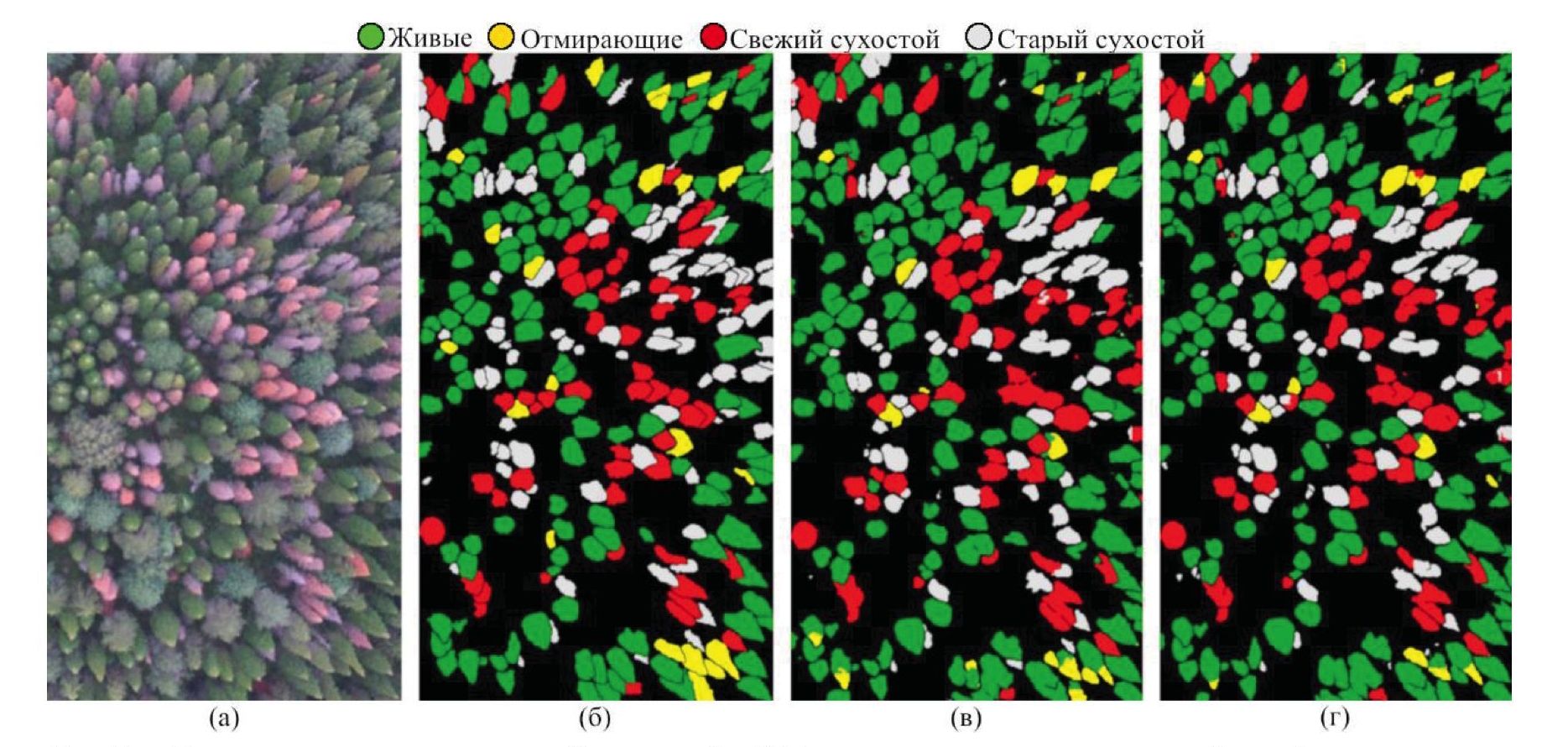Рассмотрим создание второго датасета, применяемого при решении задачи мультиклассификации пораженных деревьев кедра. Сначала перед экспертами, ведущими дешифрование ортофотопланов, ставилась задача оценки по ним состояния деревьев P. sibirica, имеющих разную степень повреждения союзным короедом I. amitinus, соответствующую одному из пяти вышеперечисленных классов. Шестым классом являлся «Фон». Каждое из деревьев на ортофотоплане путем визуального дешифрирования относилось к одному из классов экспертом (рис. 4, а), участвовавшим также в наземном обследовании этих участков леса. Затем второй эксперт производил проверку результатов разметки снимков первым экспертом и осуществлял оконтуривание крон деревьев на размеченных ортофотопланах. Итоговым результатом такого дешифрирования стали эталонные карты сегментации (рис. 4, б).
