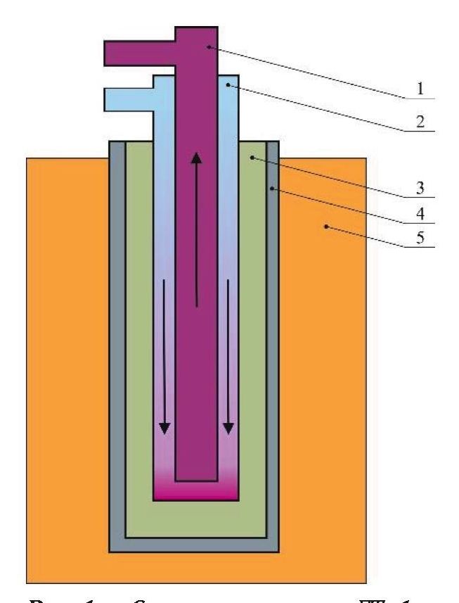Fig. 1. Diagram of a well with a geothermal heat exchanger: 1 – inner pipe; 2 – ring channel; 3 – backfill; 4 – casing; 5 – hot rock