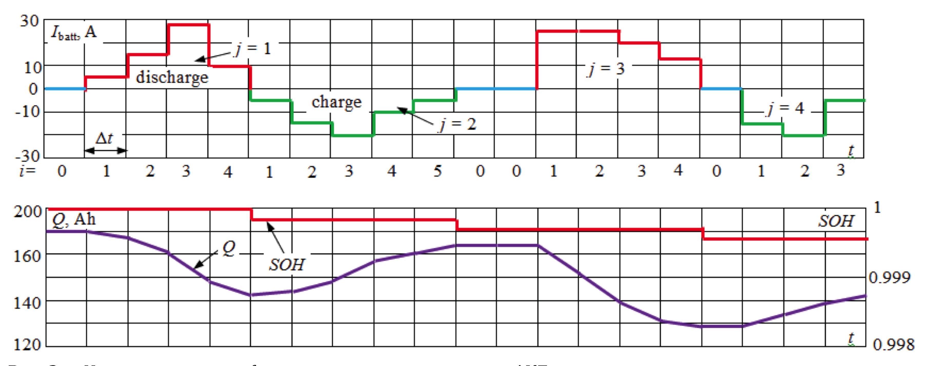 На каждом временном шаге моделирования Δt по текущим значениям тока Ibatt(t) определяются уровень заряда SOC(t) и глубина разряда DOD(t) батареи: