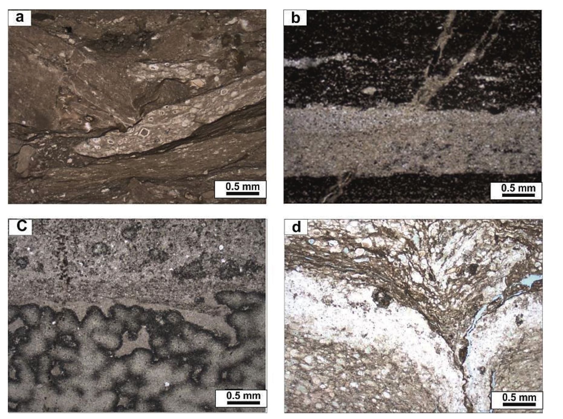 Рис. 4. Структурно-текстурные особенности пород Калинового месторождения (без анализатора): а) гравелито-дресвяная мелкозернистая структура; b) слоистая текстура. Туфопелитовый окремненный прослой в глинисто-кремнистой породе; c) биотурбитовая текстура, ходы илоедов, заполненные глинисто-кремнистым материалом с примесью органического вещества; d) деформационная текстура в зоне окремнения и сидеритизации