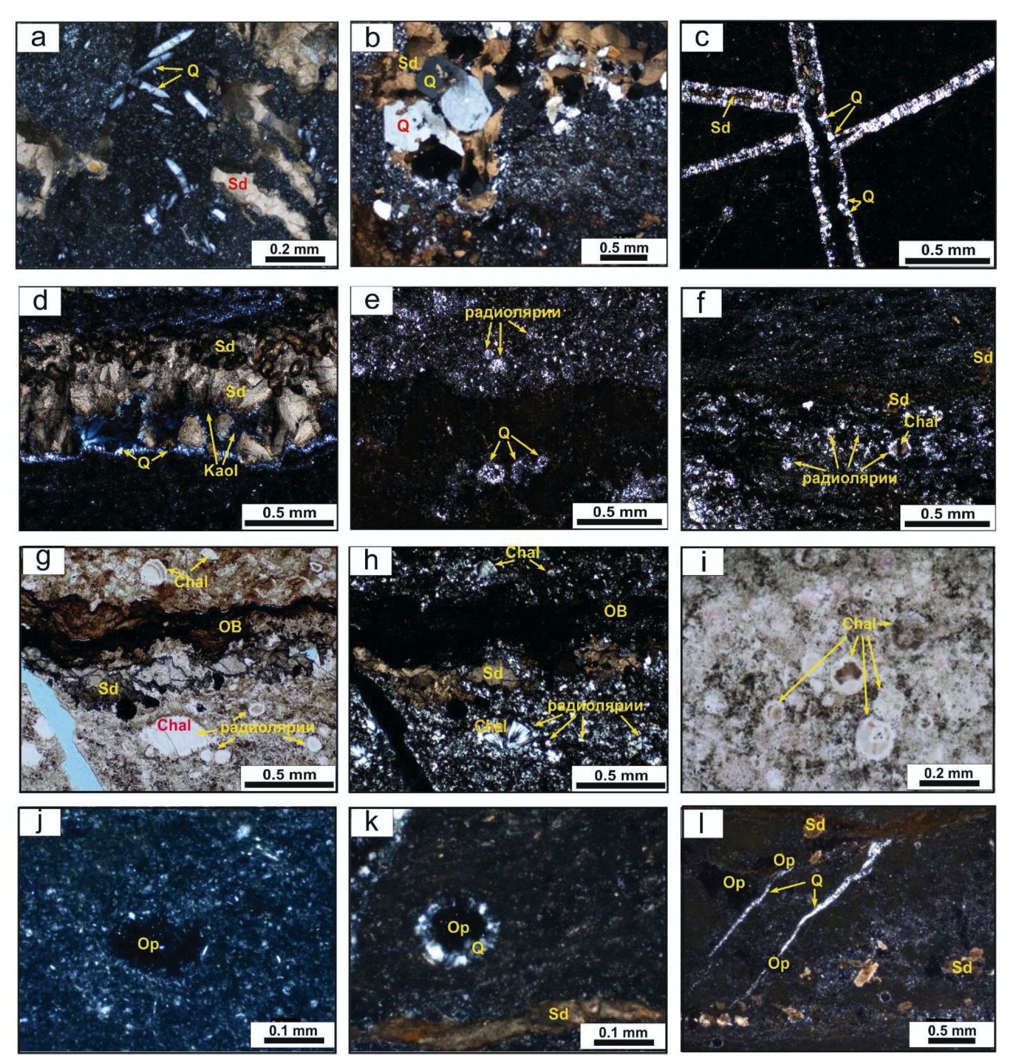 Рис. 5. Минералы группы кремнезема в породах пласта М Калинового месторождения: a) удлиненные призмы кристаллов кварца; b) гранобластовый агрегат кварца; c, d) шестоватые кристаллы кварца по периферии трещин; e) микрозернистый аутигенный кварц в раковинах радиолярий; f–i) агрегаты радиально-лучистого халцедона, частично ожелезненного; j) опал в реликтах радиолярий; k) замещение радиолярии опалом и оторочкой микрокристаллов кварца; l) опал в пустотах выщелачивания, в трещинах – кварц. Условные обозначения: Q – кварц, Chal – халцедон, Op – опал, Sd – сидерит, Kaol – каолинит, ОВ – органическое вещество. Стрелками указаны остатки радиолярий. Фотографии a–f, h, j–l – с анализатором, g–i – без анализатора